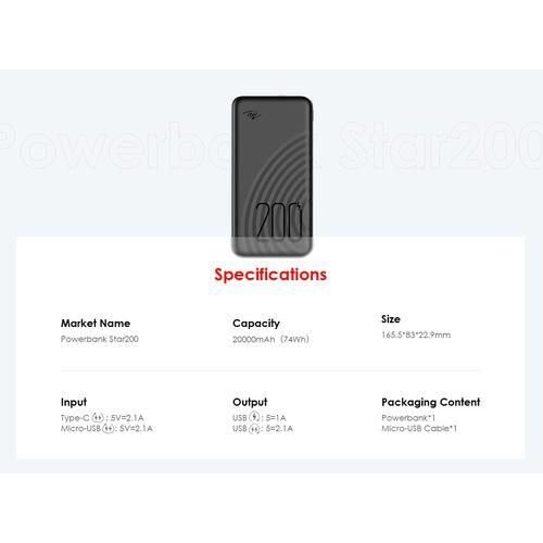 What You Get: Itel 20000mAh USB Portable Charger ; 1 * USB Cable, 1 * 12 Month Warranty