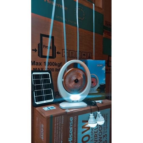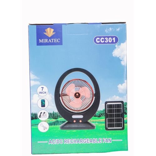 MIRATEC 16 INCH AC/DC Solar charging floor fan, solar charging, Enjoy a soft breeze in your home, office, garage—or any other room. Product features: 1. 90 range shaking head 2. Can be used while charging 3. Solar charging 4. Electricity charging 5. Intelligent cooling 6. silent work 7. Intelligent power off Product Name: Solar Panel Charger Fan Speed selection: 9 speeds Charging method: direct charge/solar charge Contents: fan x 1, solar panel x 1, adapter x 1 with an inbuilt 6000Mah battery and solar panel. It charges on Electricity and solar panel ( Sunlight) and can gives you value for your money.